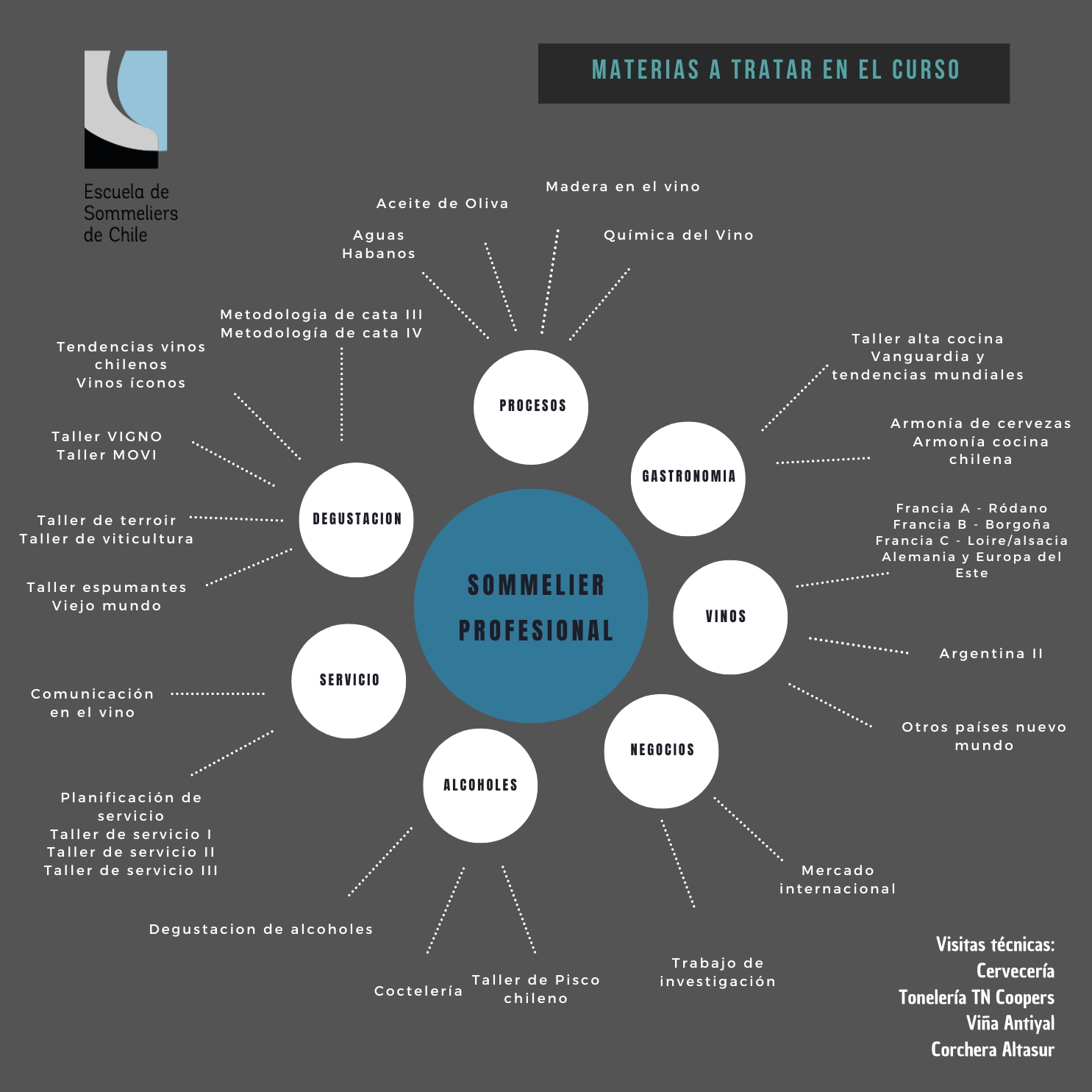 El curso Sommelier Profesional es el nivel final de la formación impartida por la Escuela de Sommeliers de Chile y está diseñado para consolidar las competencias técnicas, teóricas y prácticas necesarias para ejercer la sommelería con excelencia en entornos nacionales e internacionales. El objetivo principal es formar profesionales altamente capacitados, con una visión integral del vino, las bebidas y el servicio, capaces de liderar proyectos, tomar decisiones estratégicas y representar con solidez a la industria en distintos contextos.